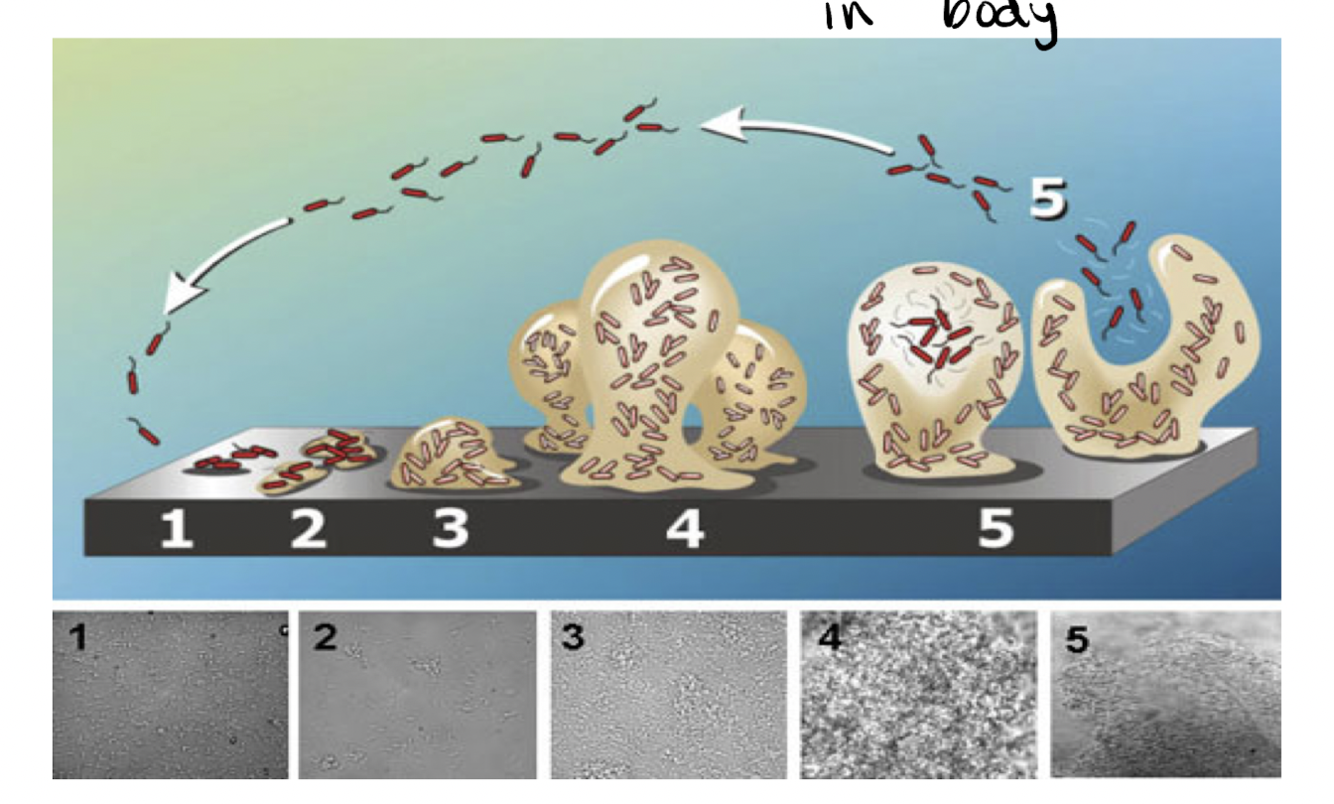 Free-floating bacteria attach to a surface. Bacteria begin to college and are held together by exopolsaccharide (EPS). EPS enables the biofilm to develop a complex structure. Alignate is a compound in EPS that inhibits innate immune defenses.