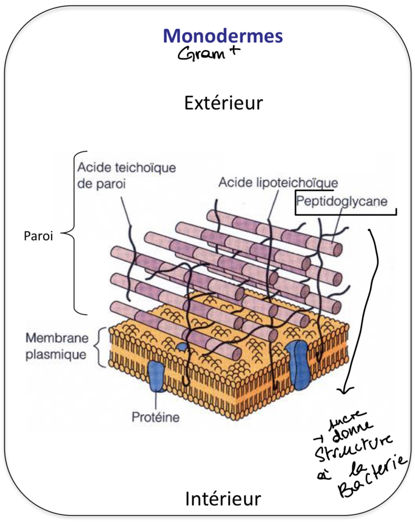 Entourée de memebrane + PAROI RIGIDE de peptidoglycanes qui leur donne leur structure: