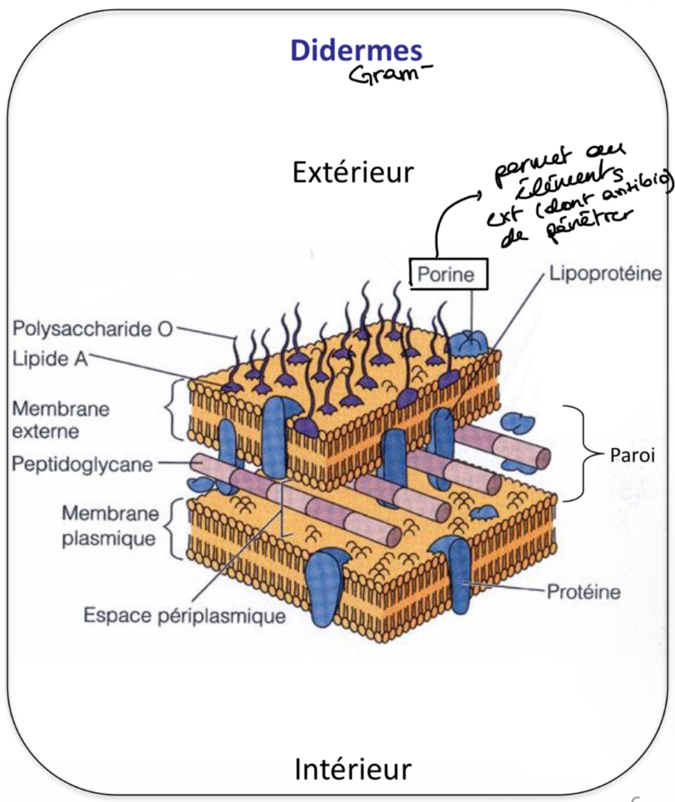 Pores dans la membrane ext = trop étroit pour laisser passer les antibios