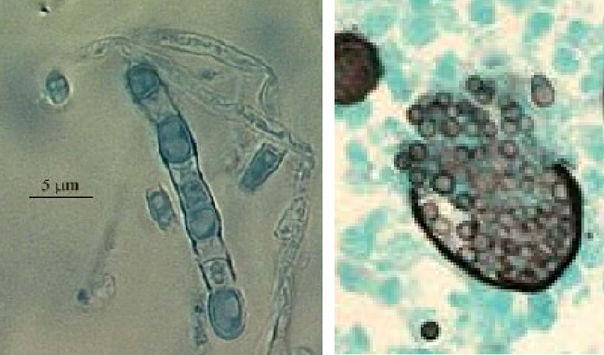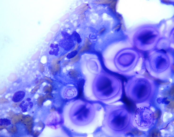 This is a fungal disease that occurs when the organism is inhaled and is disseminated to skin, eyes, CNS, lungs, or other areas. The upper respiratory tract is most often involved and symptoms can include nasal discharge, sneezing, swelling over the nose, and regional lymphadenopathy. If the CNS is involved, seizures can also occur. The disease has been thought to be transmitted most often through infected pigeon droppings. Itraconazole or fluconazole are the anti-fungals of choice for this disease. Doxycycline, Trimethoprim sulfa, and Clavamox are all antibiotics and would not address a fungal infection. Lufenuron is a flea treatment that has had some implications for treatment of dermatophytes due to its ability to inhibit chitin. About 1/3 of the cell wall of a fungus is composed of chitin. This has not been a promising or approved treatment for ringworm and surely would not be an appropriate treatment for Cryptococcus.
