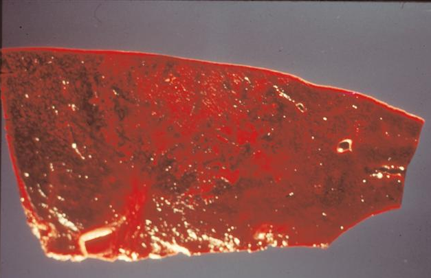 C) 10-wk-old moribund kitten euthanized at owner’s request; the lungs were consolidated and mottled dark red-gray, with marked alveolar infiltrates of neutrophils and macrophages