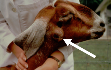 B) mature ram with a swollen testis; upon examination after surgical removal, the testis contained multifocal pyogranulomas with caseous abscesses of the epididymis