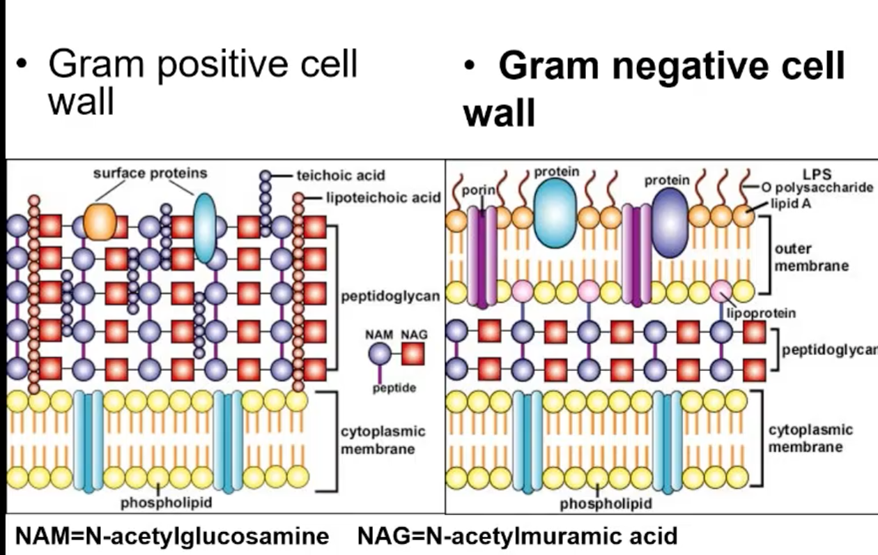Gram negative: Have a cytoplasmic membrane and a lipopolysaccharacide membrane with a peptidoglycan layer between them