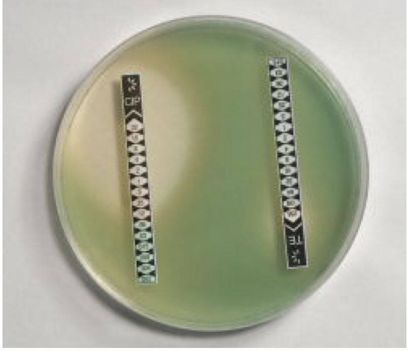 Strips with different antibiotic concentrations –> see to where the bacteria grows