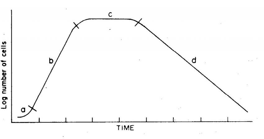 Stationary - decreased nutrients, △pH, builup to toxic products