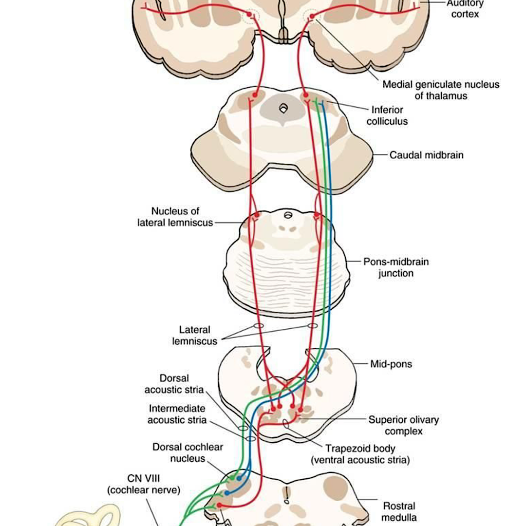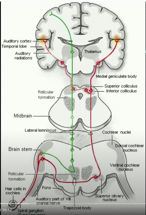 The pathology is somewhere between the distal cochlear nerve and the lateral lemniscus