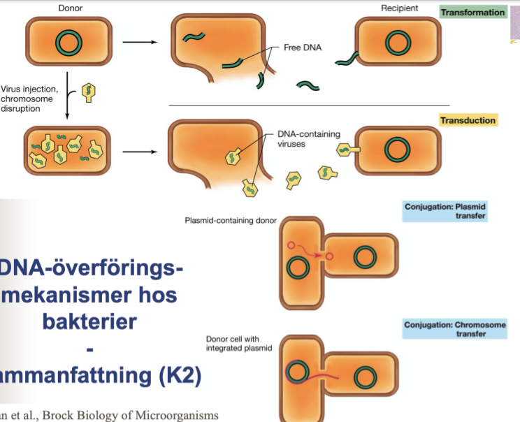 Vad innebär transformation, transduktion och konjugation?