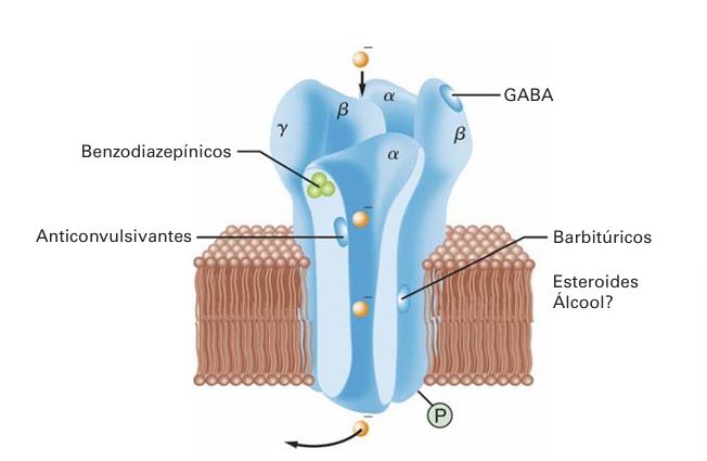 GABA, e sua ação no receptor GABAa causa aumento do transporte de íons cloreto Cl- através da membrana e dentro do neurônio pós-sináptico, que torna-se hiperpolarizado, o que inibe funcionalmente a propagação adicional dos sinais nervosos.