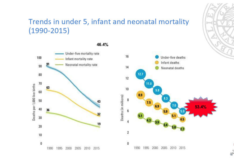 75 % av barn som dör är under 1 år. U5MR har minskat till 37/1000 - bra!