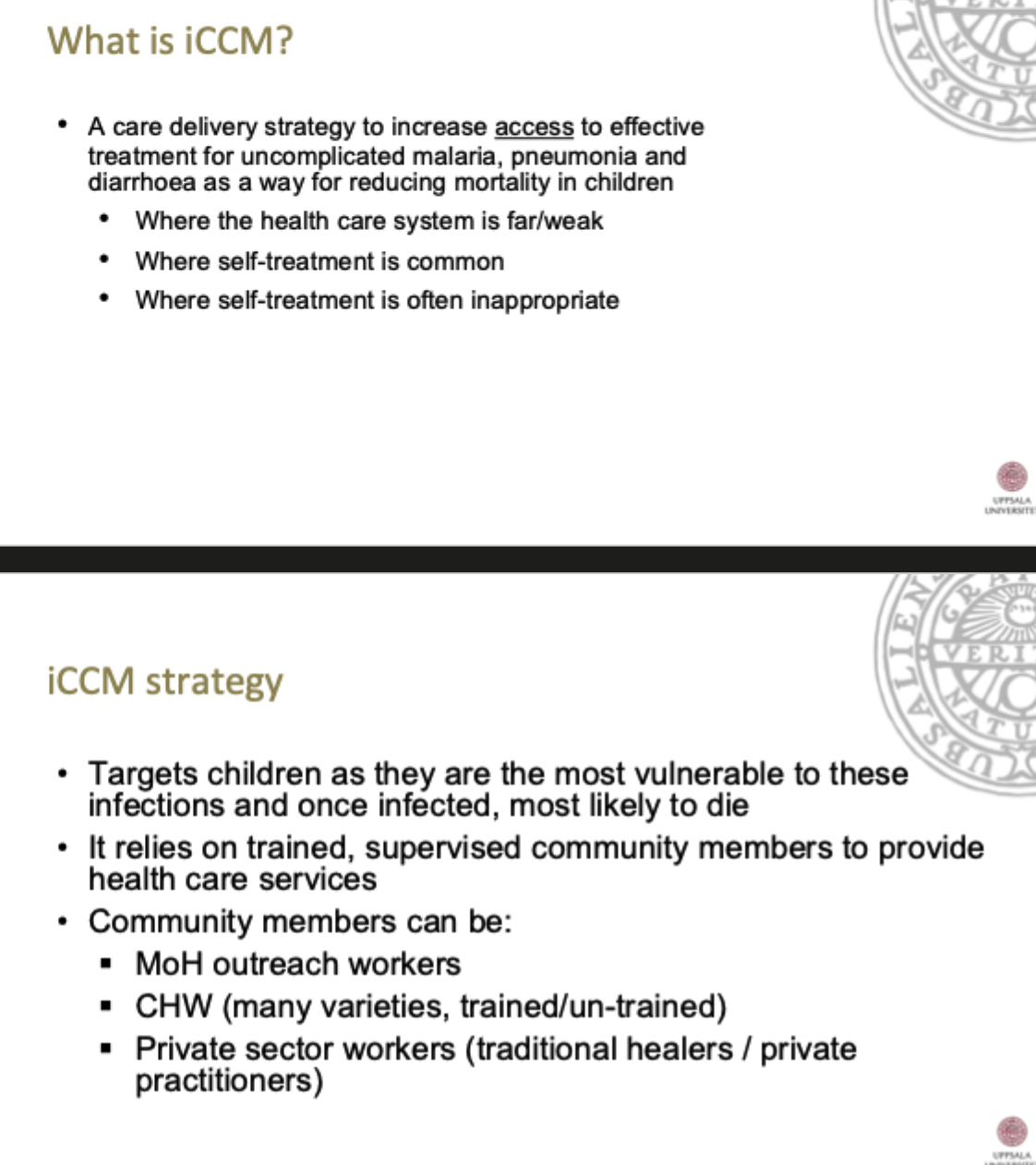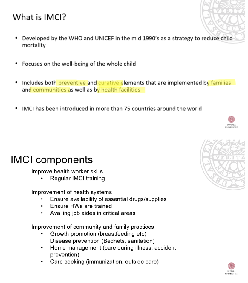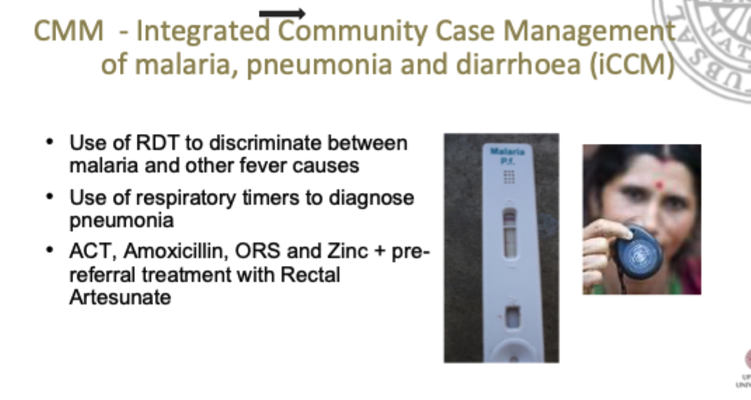 iCCM är alltså en “förlägning” av ICMI för att nå dem mest utsatta i landbygden, för att minska mortaliteten i pneumoni, malaria och diarré