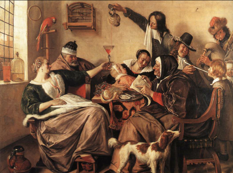 He remarks how the father quietly and moderately admonishes his daughter who is seen from behind. The woman in black, sipping from a glass, Goethe interprets as the young woman’s mother, who lowers her eyes so as not to be too attentive to the ‘father’s admonition’. This moralizing title, however, is without foundation and not in accordance with Ter Borch’s usual themes.