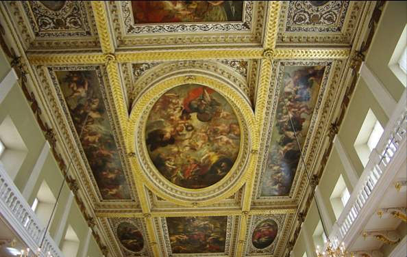 Constantijn Huygens the Elder (1596 - 1687), Lord of Zuylichem, served in the Dutch embassies in Venice and London and was knighted by James I in 1622. He became secretary and adviser to successive members of the ruling House of Orange, beginning with Prince Frederick Hendrick in 1625. He visited Amsterdam in 1627 and was married there in April of the same year. De Keyser’s painting emphasises both the sitter’s official role and his private interests. The tapestry on the rear wall of the room, decorated with the Huygens arms, represents the subject of Saint Francis before the Sultan. The elaborate still life of objects on the table includes a musical instrument (a chitarrone), plans apparently showing architectural projects, and a pair of terrestrial and celestial globes.