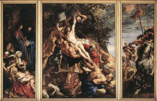 Peter Paul Rubens (1577–1640), Raising of the Cross with Saints Amand, Walpurgis, Eligius and Catherine, 1610. Oil on panel