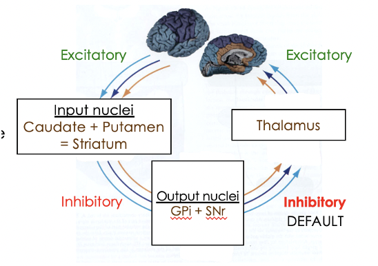 Describe the neurones and structures involved in the default circuit of the basal ganglia