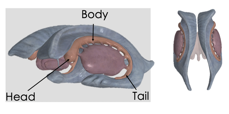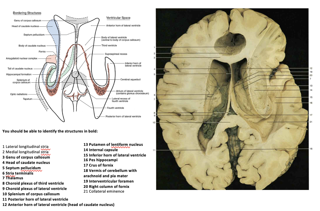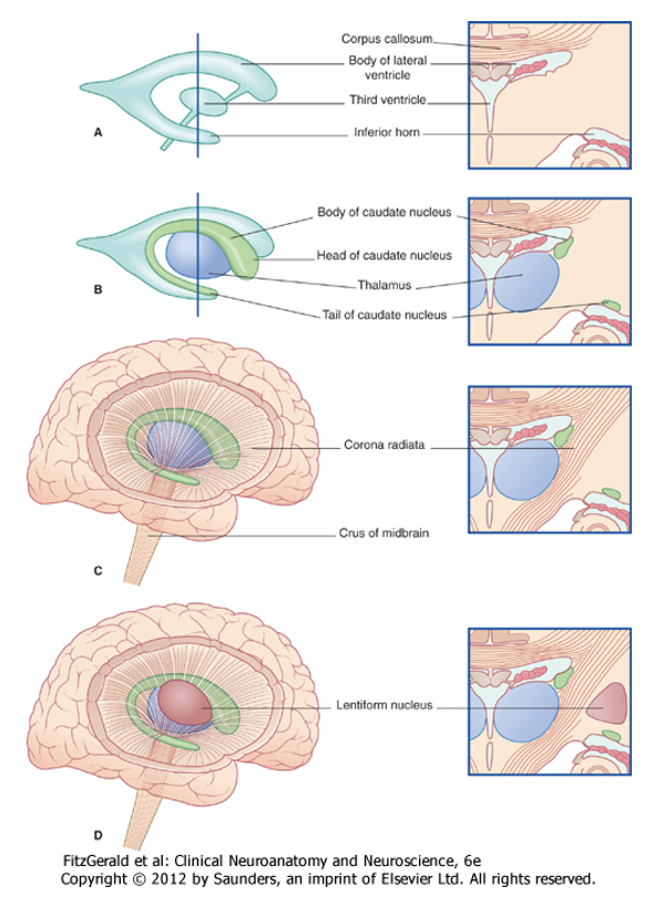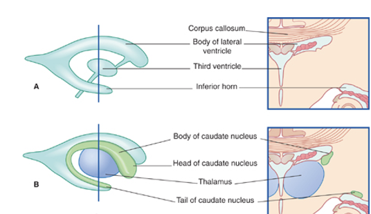 What are the relationships between the caudate nucleus and the lateral ventricle?