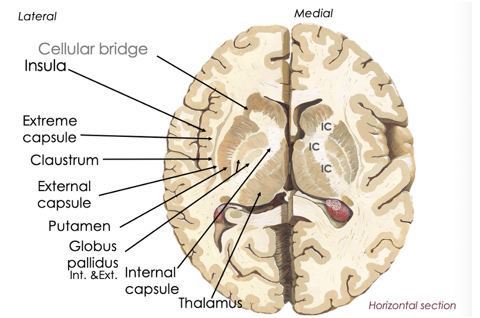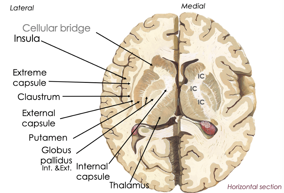 Name the structures from lateral to medial starting at the insula