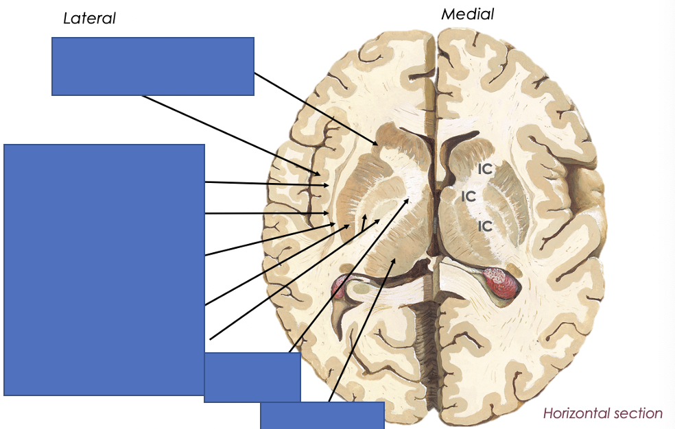 What structure lies lateral to the caudate nucleus and what lies lateral to this?