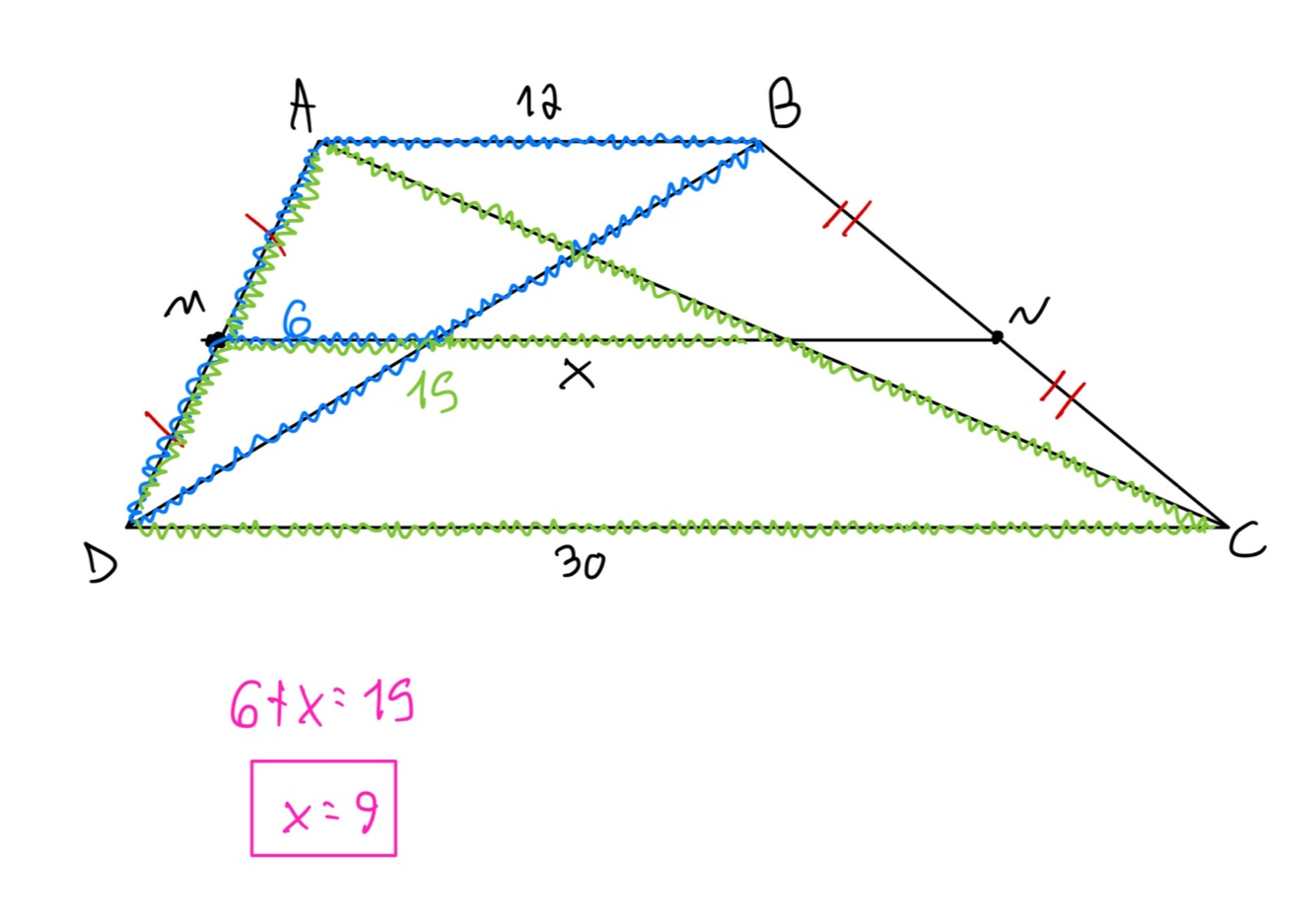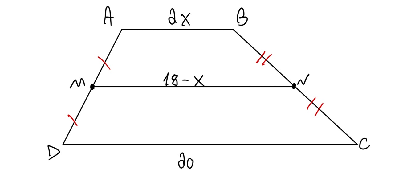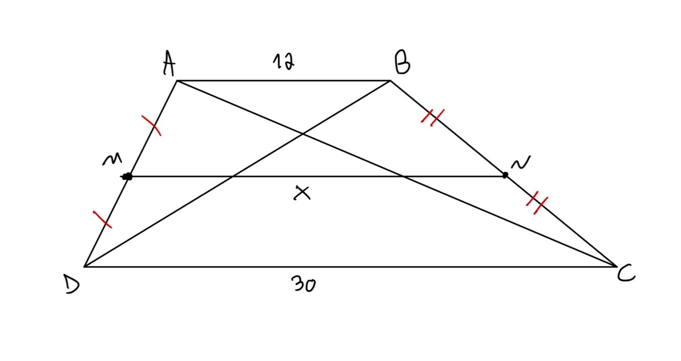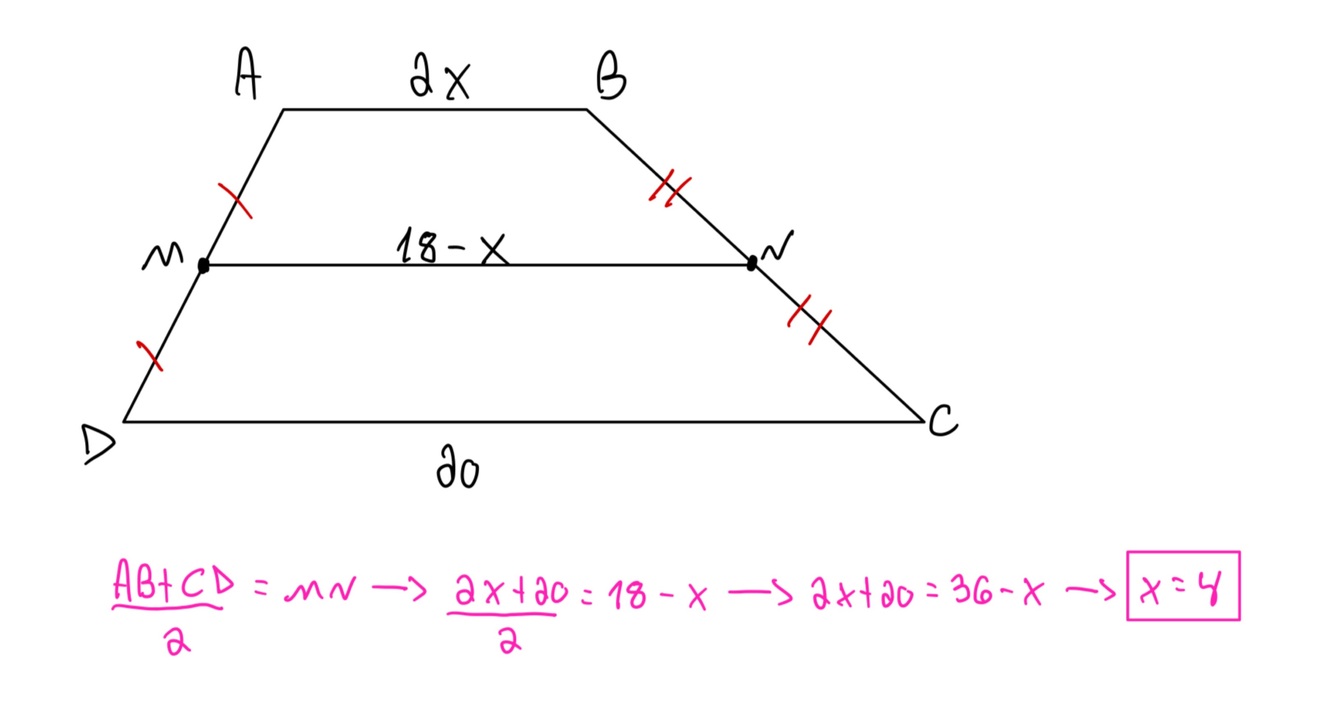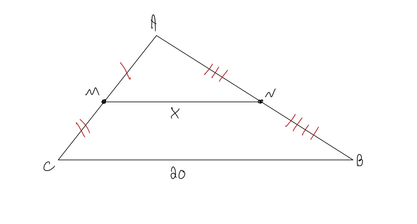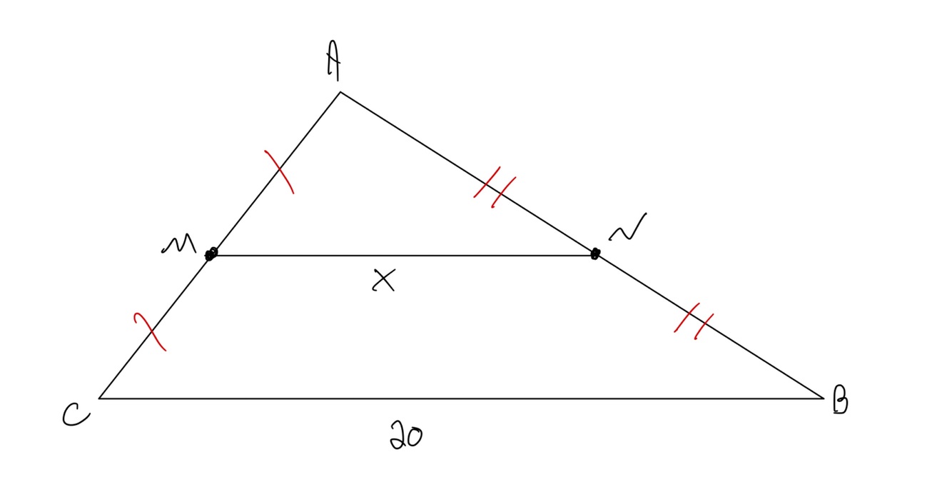 X vale 10, ou seja, metade do segmento BC, pois MN é base média, já que os lados do triângulo ABC estão divididos igualmente.