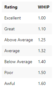 Walks, Hits, Innings Pitched (WHIP) is the sum of a pitcher’s walks and hits, divided by his total innings pitched. Hit batsmen, errors and hitters who reach via fielder’s choice do not count against a pitcher’s WHIP.