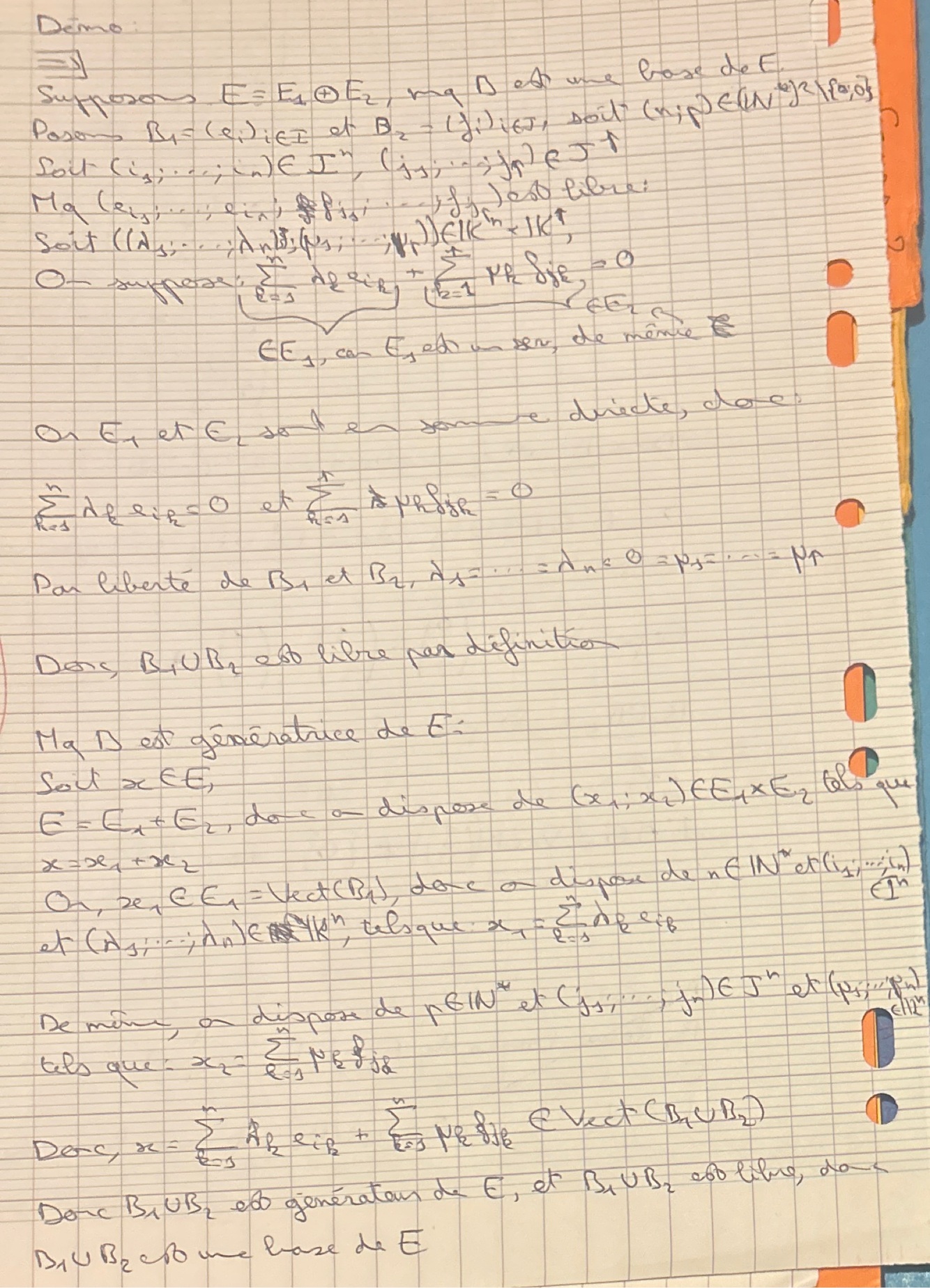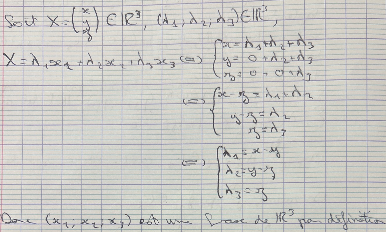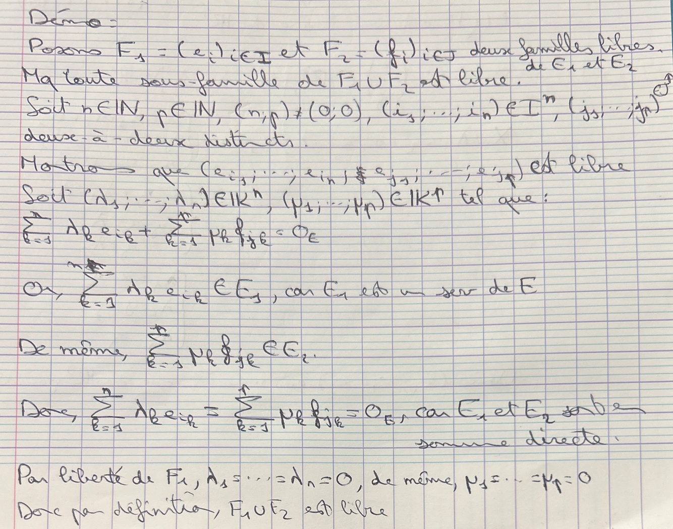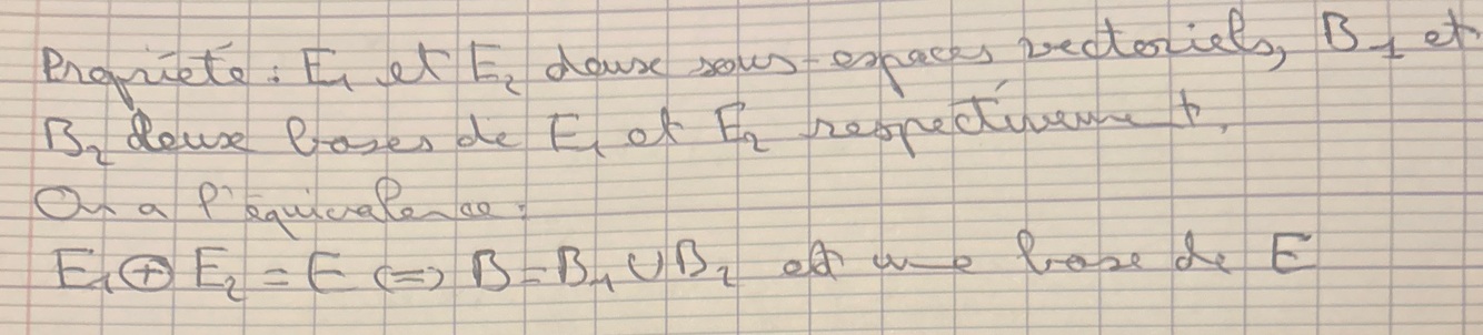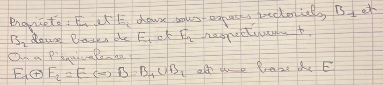 On veut s’assurer qu’aucun vecteur ne peut être la combinaison linéaire d’autres, donc qu’il ne peut être «ramené à 0» par les nouveaux vecteurs qui arrivent. C’est le cas si les deux espaces sont en somme directe : puisque le vecteur initial est différent de 0, aucun élément du nouvel ensemble ne pourra le ramener à 0 (def de la somme directe)