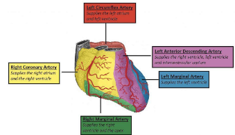 Vänster kranskärl avger två viktiga grenar. Den anteriora interventrikulära artären (främre nedåtstigande grenen, LAD) förser höger och vänster ventrikel samt det interventrikulära septumet. Ramus circumflexus (LCA, den vänstra kransartärens bakåtriktade gren, RCX) förser den vänstra ventrikeln, och en av dess grenar är den vänstra marginalartären (LMA).