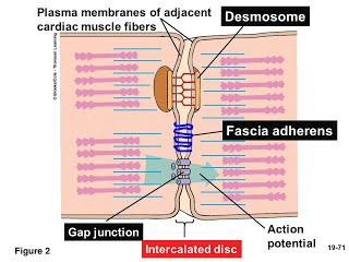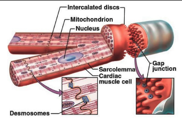 I slutet av varje myocyt så finns det en intercalated disk, vilken förbinder myocyterna tillsammans med hjälp av desmosomer (tät koppling mellan cellerna), gap junctions (samverkande sammandragningssignaler) och adherens junctions (fascia adherens i hjärtmuskulatur). Utan dessa intercalated discs så hade inte hjärtat kunna jobba som ett enda funktionellt organ. Detta skiljer sig från vanlig skelettmuskulatur.