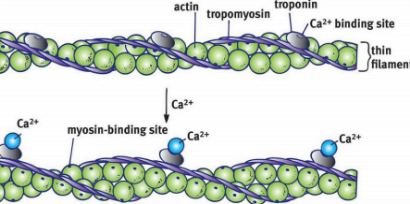 På aktinet finns det ett antal troponin utspridda. När kalcium frigörs i en hjärtmuskelcell och binder in till troponin så förflyttas tropomyosin och blottlägger bindningsplatser för myosinhuvudena. Myosinhuvudena är beroende av ATP för att genomgå en konformationsförändring där de binder in till bindningsställen på aktinfilamentet och genom ytterligare konformationsförändring så kan de förflytta sig längs aktinfilamentet så att en kontraktionskraft uppstår.