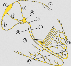 Från AV-knutan så sprids impulsen ned till His-bunten (7), och härifrån så delas den upp i en höger och vänster skänkel som i sin tur förgrenar sig ytterligare och sprider impulsen till höger samt vänster kammare.
