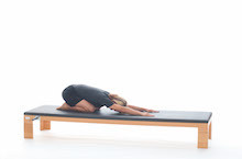 Set up: Kneel with pelvis resting on the heels, trunk relaxed over thighs, arms reaching forward, neck relaxed and forehead on the mat
