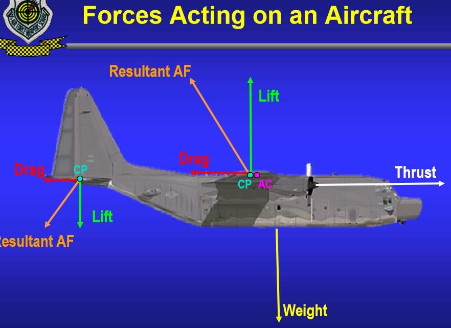 Label a picture of the following: Lift, Drag, CP, AC, Resultant AF, Weight, Thrust