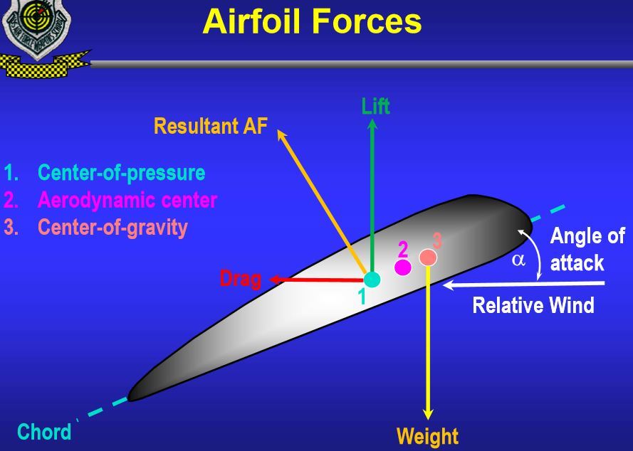 Label a picture with Airfoil Forces; include Center of Pressure, Aerodynamic Center, Center of Gravity, Angle of Attack, Relative Wind, Chord, Lift, Drag, Weight, Resultant AF.