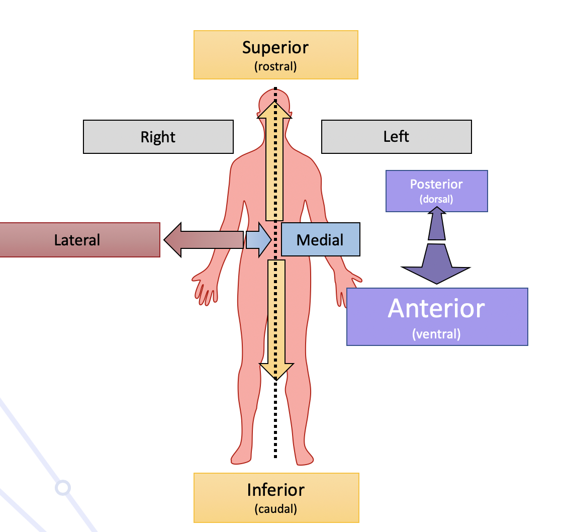 Explain basic anatomical terminology (superior, inferior, dorsal, ventral, posterior, anterioir, proxal, distal, lateral medial)