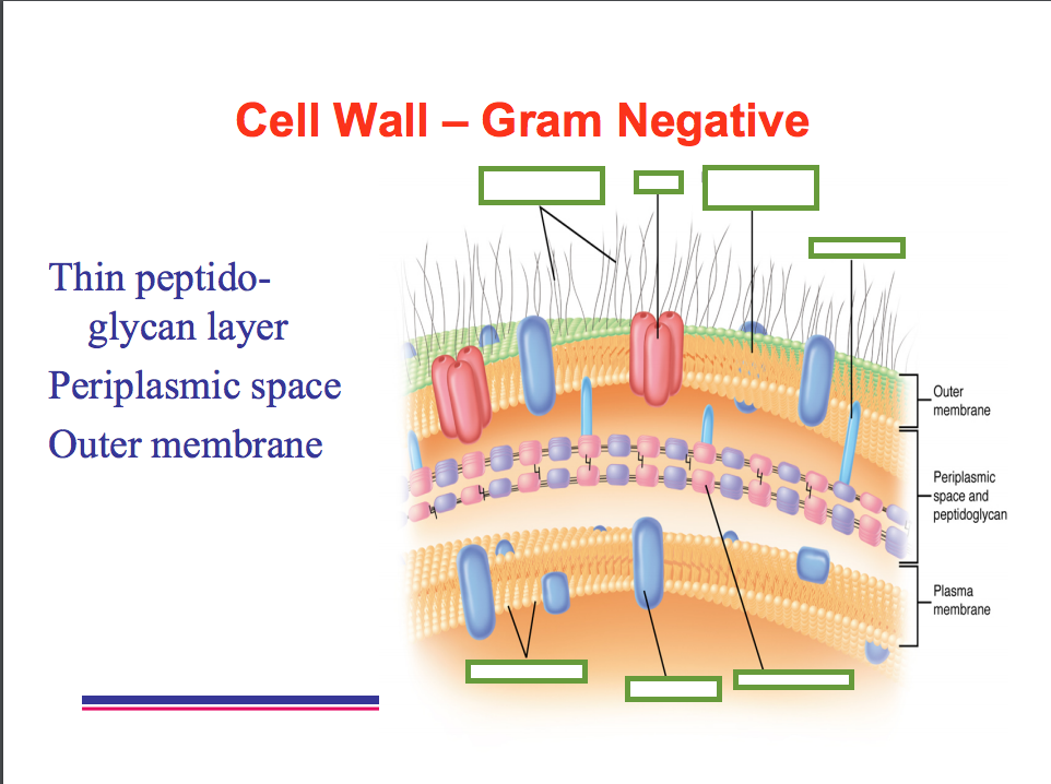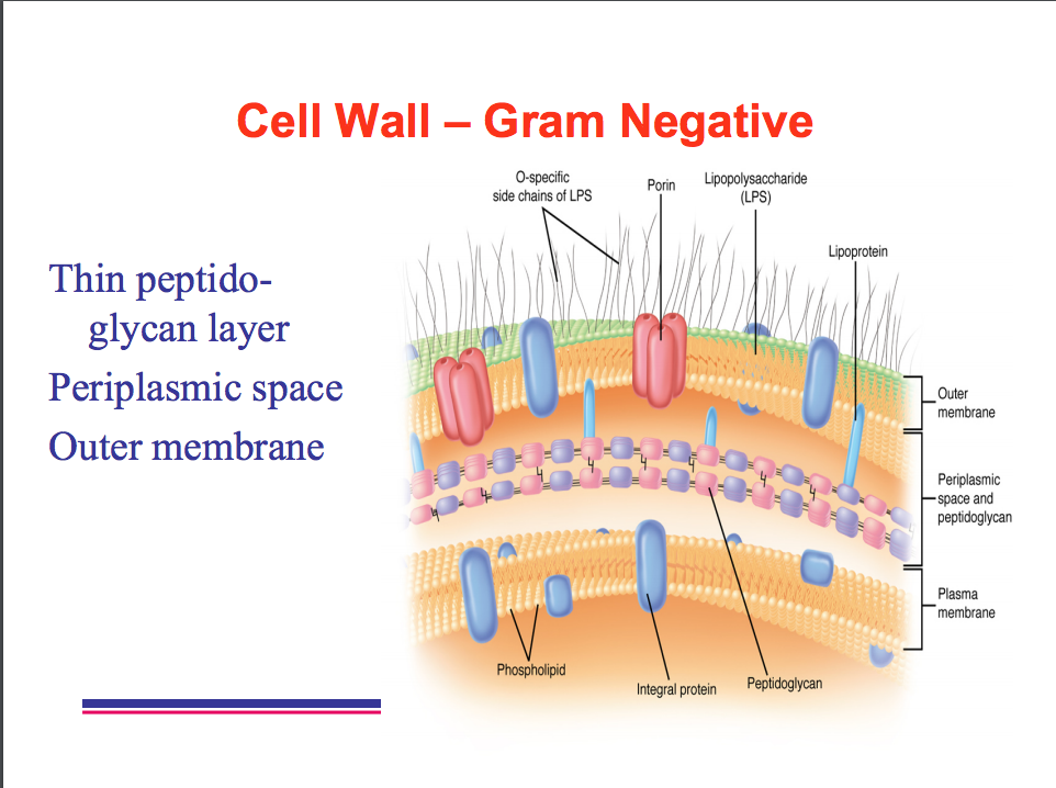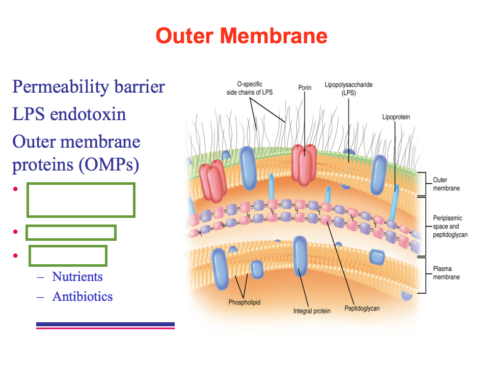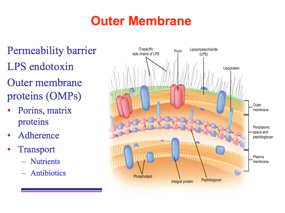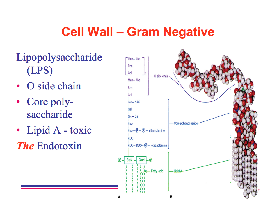 • LPS consists of a toxic lipid A, a core polysaccharide, and polysaccharide side chains called O antigens in some bacteria.
