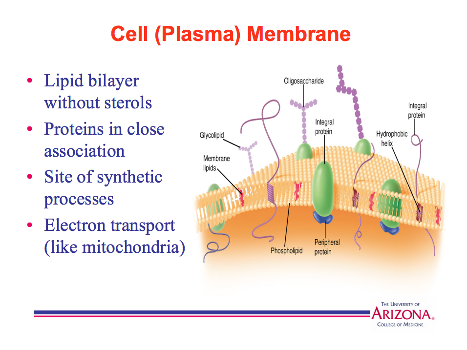 The bacterial cell (plasma) membrane is exceptionally rich in proteins and does not contain sterols. It plays a role in segregation of daughter chromosomes at cell division, analogous to the role of the mitotic apparatus of eukaryotes. The membrane is the site of synthesis of DNA, cell wall polymers, and membrane lipids and contains the entire electron transport system of the cell. Like cell membranes of eukaryotes, it is a permeability barrier and contains proteins involved in selective and active transport of solutes. It is also involved in secretion to the exterior of proteins, including exotoxins and hydrolytic enzymes involved in the pathogenesis of disease.