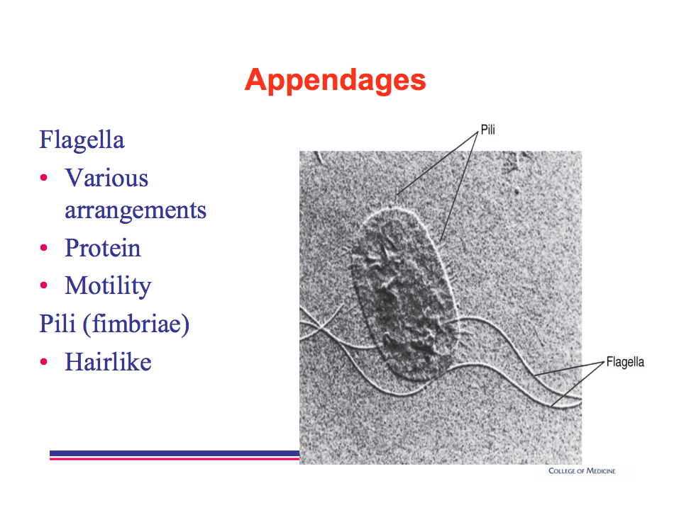 Flagella are molecular organelles of motility found in many species of bacteria, both Gram positive and Gram negative. They may be distributed around the cell (peritrichous), at one or at both ends of the cell (polar). In all cases, they made of proteins, are long (up to 20 µm) individually helical in shape and propel the cell by rotating at the point of insertion in the cell envelope. The presence or absence of flagella and their position are important taxonomic characteristics.