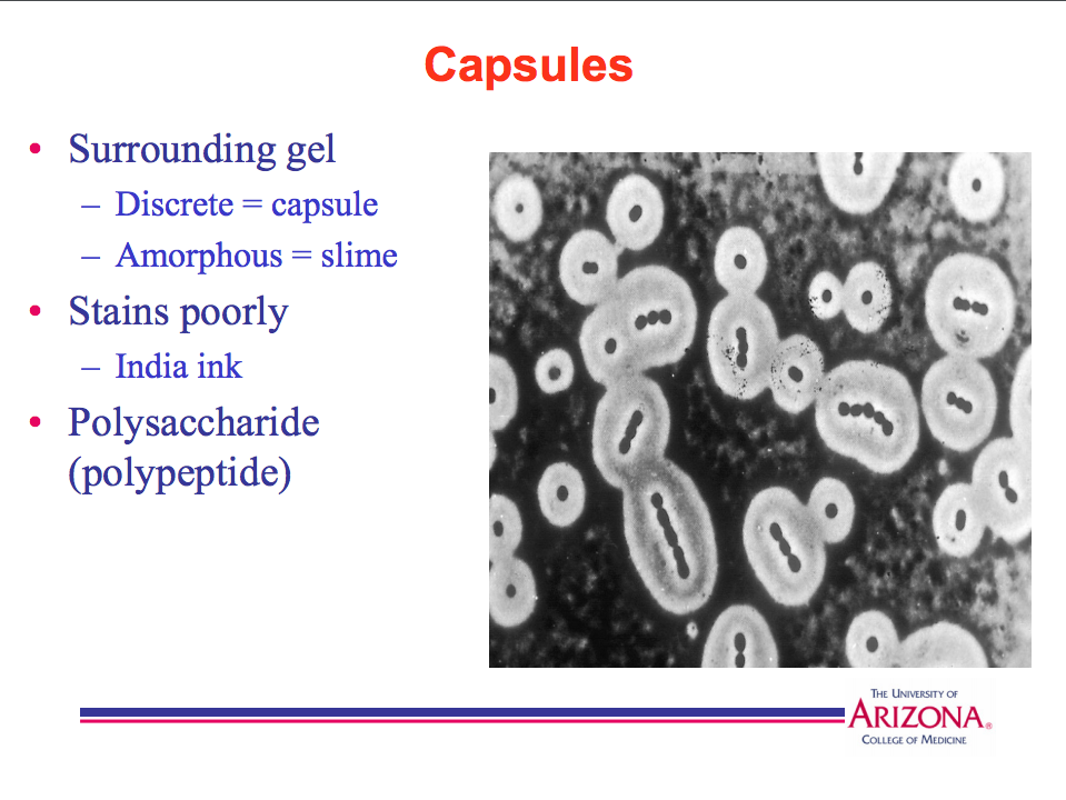 Many bacterial cells surround themselves with one or another kind of hydrophilic gel. This layer is often quite thick; even thicker than the diameter of the cell itself. Because it is transparent, this layer is usually not seen microscopically unless special stains are used or it is made visible by its ability to exclude particulate material, such as India ink. If the material forms a reasonably discrete layer, it is called a capsule; if it is amorphous in appearance, it is referred to as a slime layer. Most capsules or slime layers are polysaccharides made of single or multiple types of sugar residues.