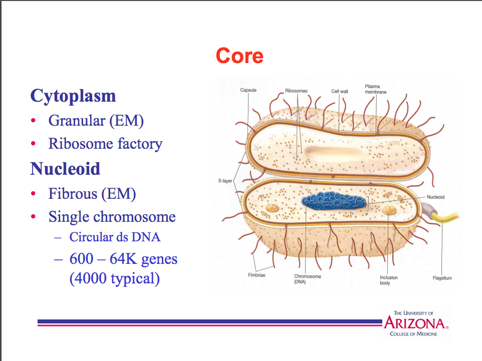 In contrast to the structural richness of the layers and appendages of the cell envelope, the interior seems relatively simple. There are two clearly visible regions, one granular (the cytoplasm) and one fibrous (the nucleoid).