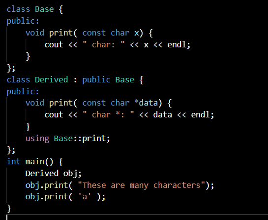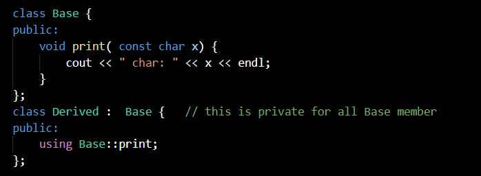 if derived class has the same function name then that function no longer access on base class. We can use “using ::; to make it available. or you can explicit specify ::