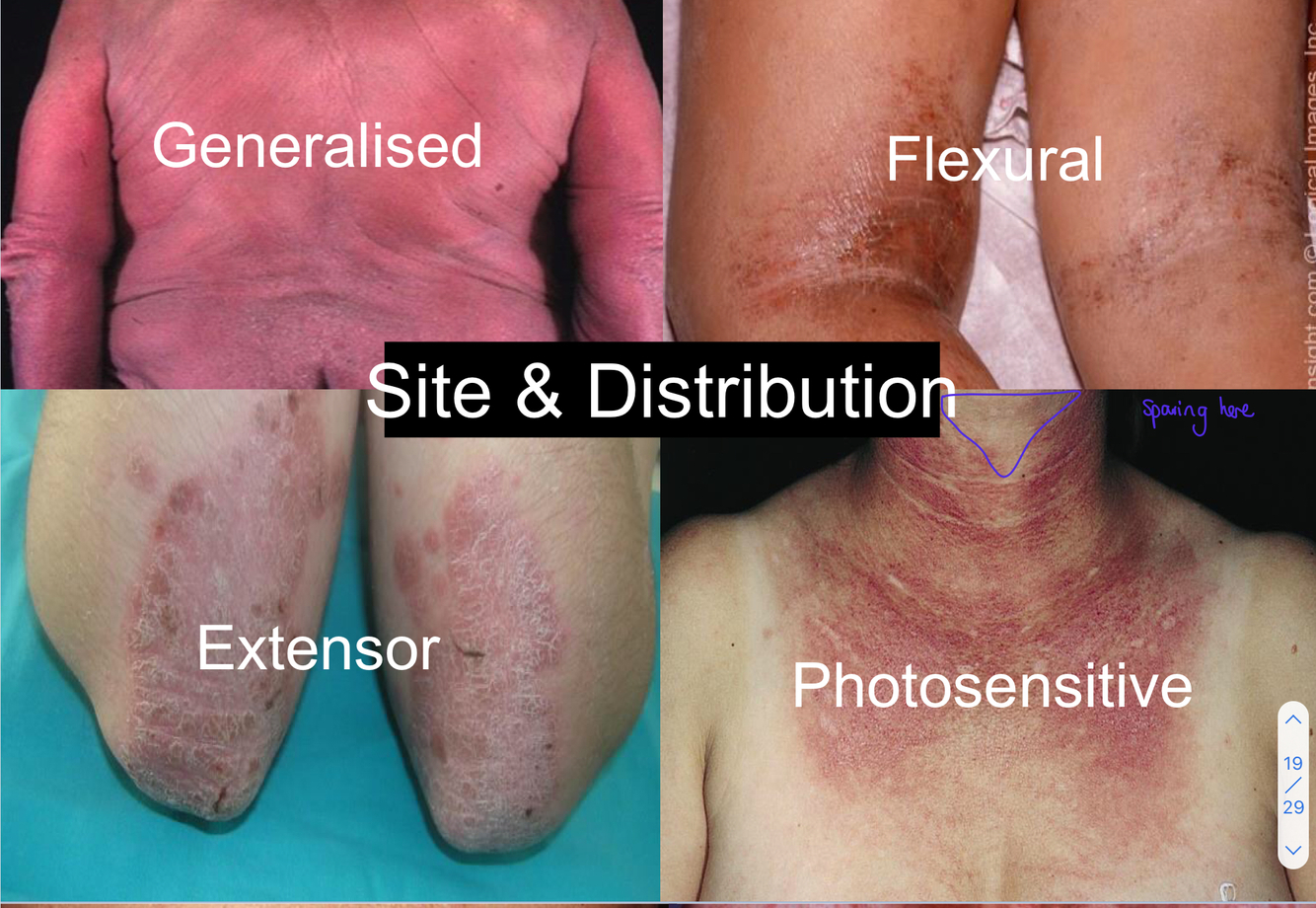 What are the different sites and distribution descriptions for dermatology issues?
