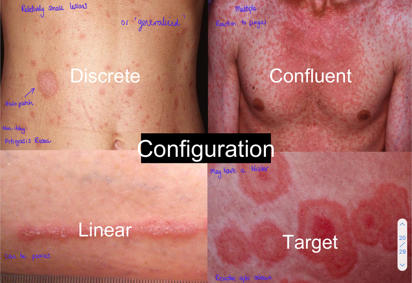 What are the 4 different ways to decribe configuration of skin issues?