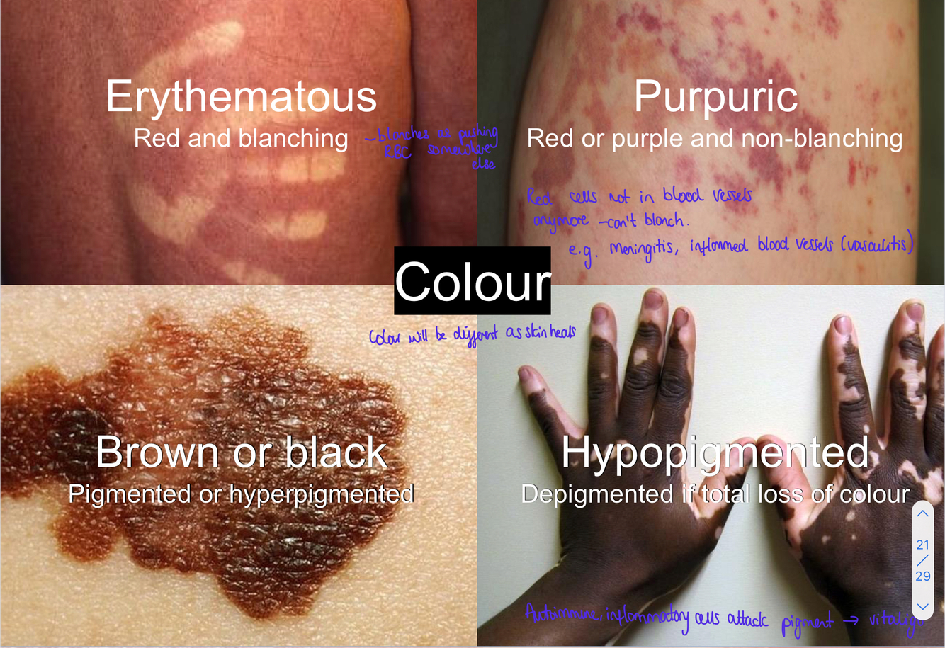 What are the 4 different ways to describe the colour of dermatological issues?