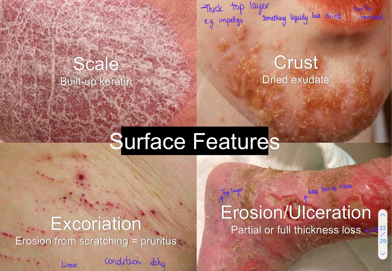 What are the 4 different surface features of dermatology issues?