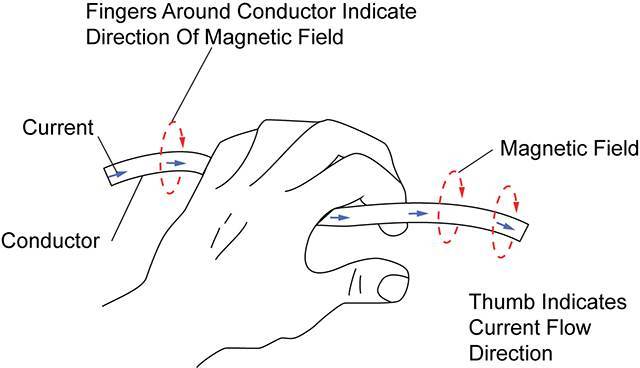 Apply the left hand rule for current carrying conductors to determine the direction of lines of magnetic flux