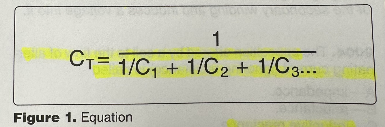 When different rated capacitors are connected in parallel in a circuit, the total capacitance is (Note: Ct = C1 + C2 + C3…)…