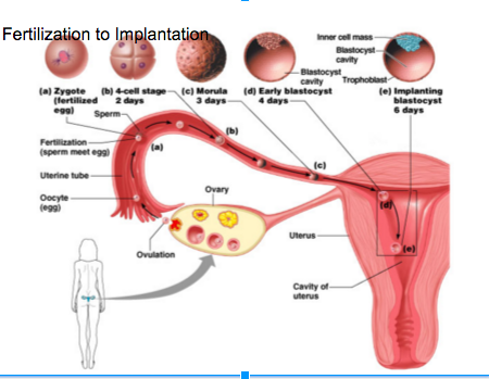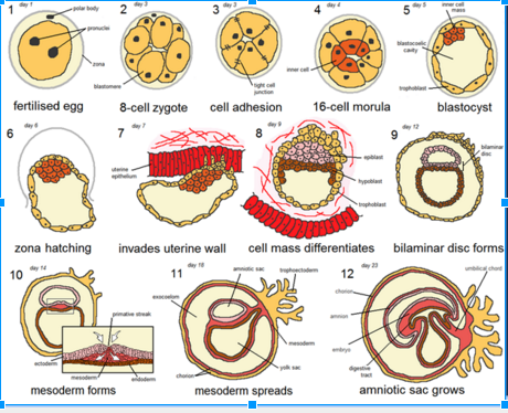 Describe the 12 steps between the fertilized egg and the start of the amniotic sac growing