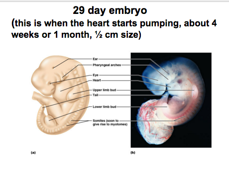 this is why drugs early in pregnancy are so important to avoid – many cause birth defects; baby is a little over 1” long (below right)