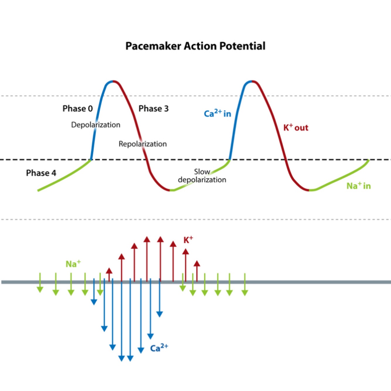 Calcium, sodium, and potassium are all responsible for generating an action potential in the sinoatrial node. An influx of calcium is responsible for the actual depolarization of the cell, while an efflux of potassium repolarizes the cell after depolarization. After repolarization, funny sodium channels cause spontaneous depolarization, augmented by the opening of calcium channels that speed the spontaneous depolarization during phase 4 of the action potential.