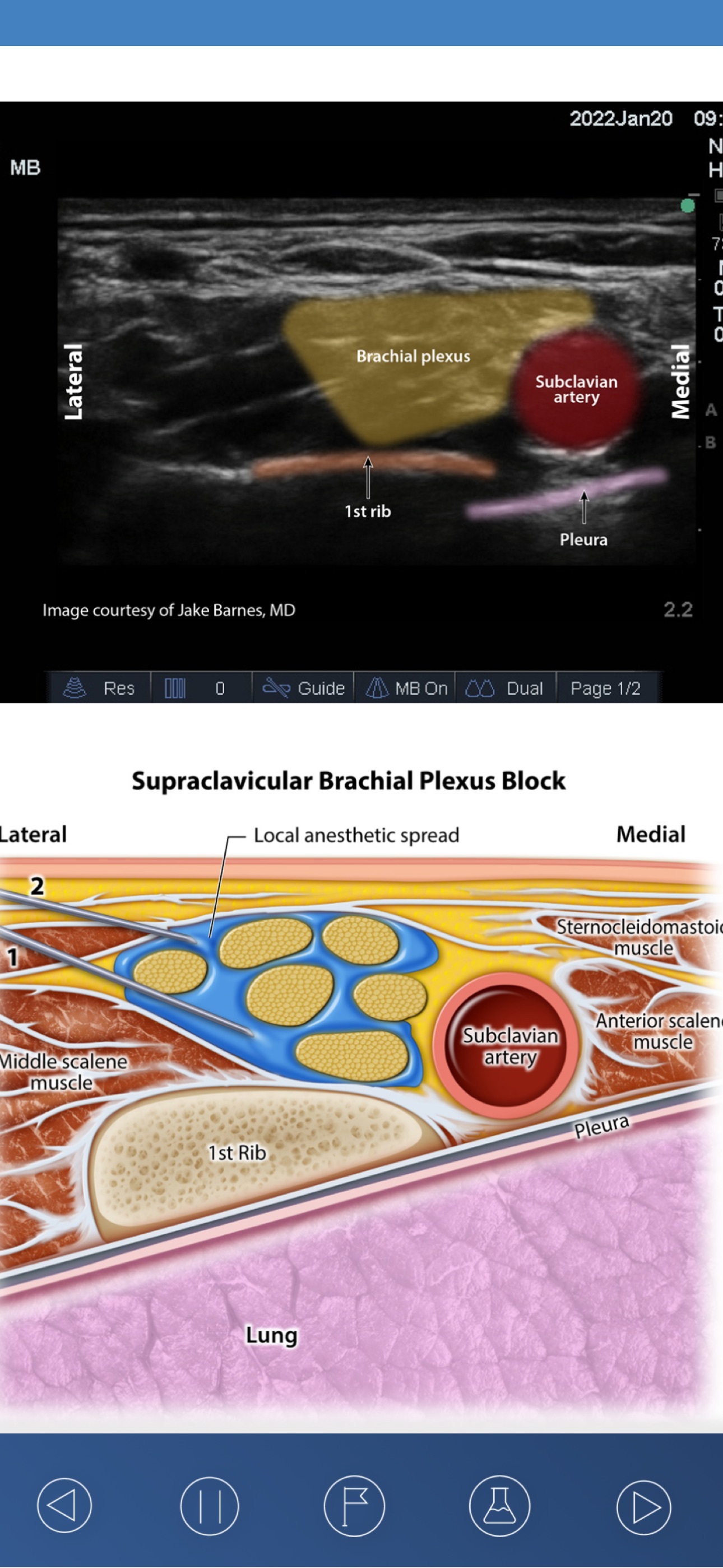 A supraclavicular block is performed at the level of the distal trunks and proximal divisions of the brachial plexus. Major structures involved at this level include the brachial plexus, subclavian artery, first rib, and pleura. The brachial plexus lies superficial and lateral to the subclavian artery, and the subclavian artery lies superficial to the first rib.