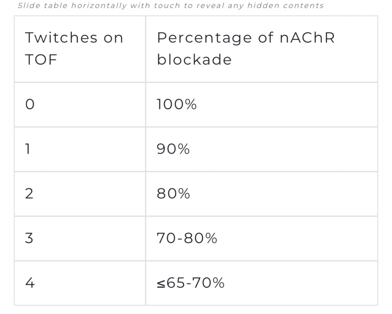 Double burst stimulation is a series of two short tetanic stimulations (two impulses at 50 Hz, separated by 750 ms) which correlates well to the TOF ratio up to a ratio of 0.6. Tetanus is a sustained stimulus of 50 to 100 Hz for five to ten seconds and can be useful in confirming adequate reversal of neuromuscular blockade