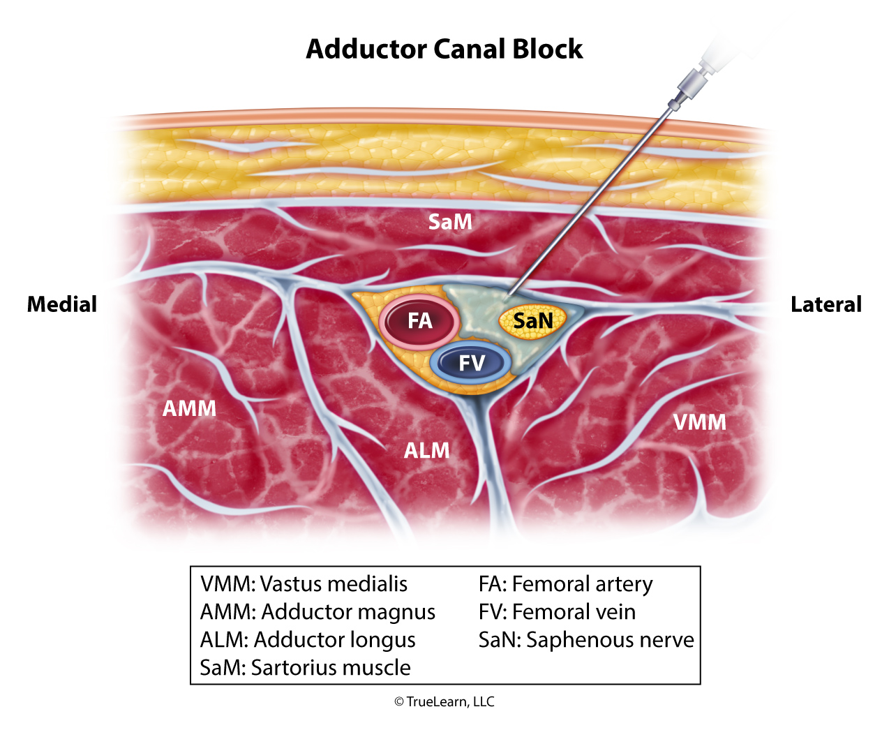adductor canal block, a variant of a saphenous block, is often used as an analgesic adjunct for knee surgery. pain relief provided by adductor canal block is noninferior to that of femoral nerve block. Adductor canal blocks were also found to have less risk for falls. Although the saphenous nerve is purely sensory, an adductor canal block often affects the nerve to the vastus medialis because of its location within the adductor canal. Motor weakness may occur, and patients should be closely monitored as they begin to ambulate.